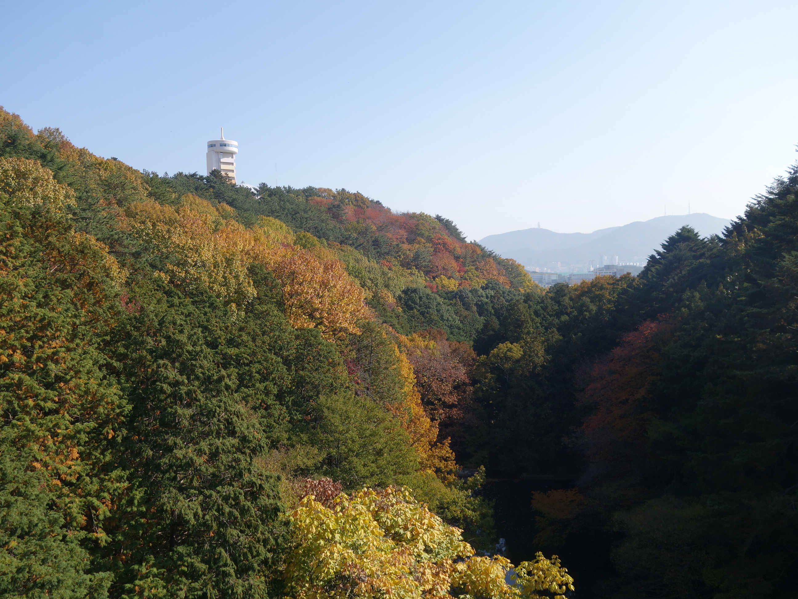 ↑ 수원지 둑에서 본 멀리 금련산과 황령산.