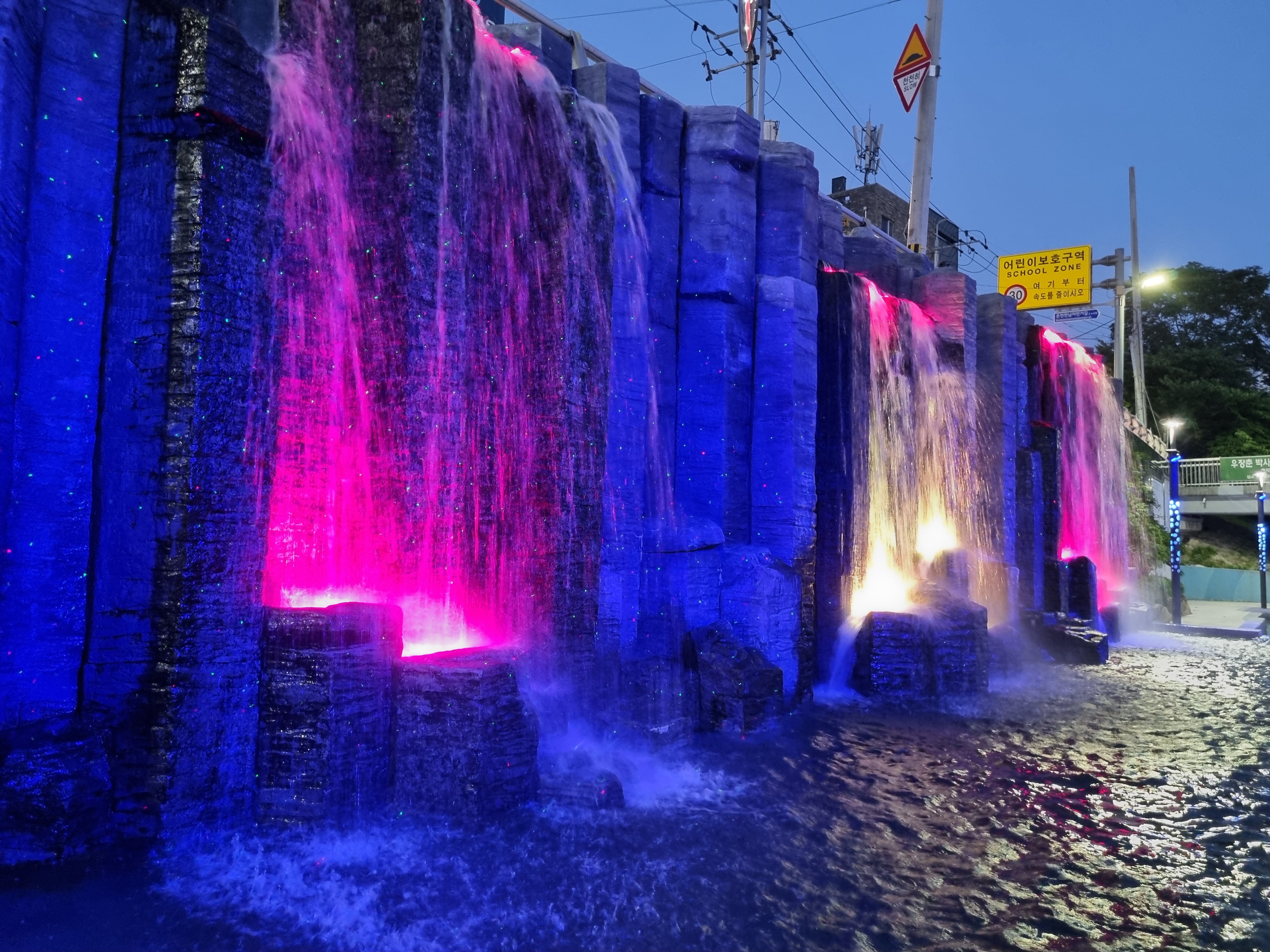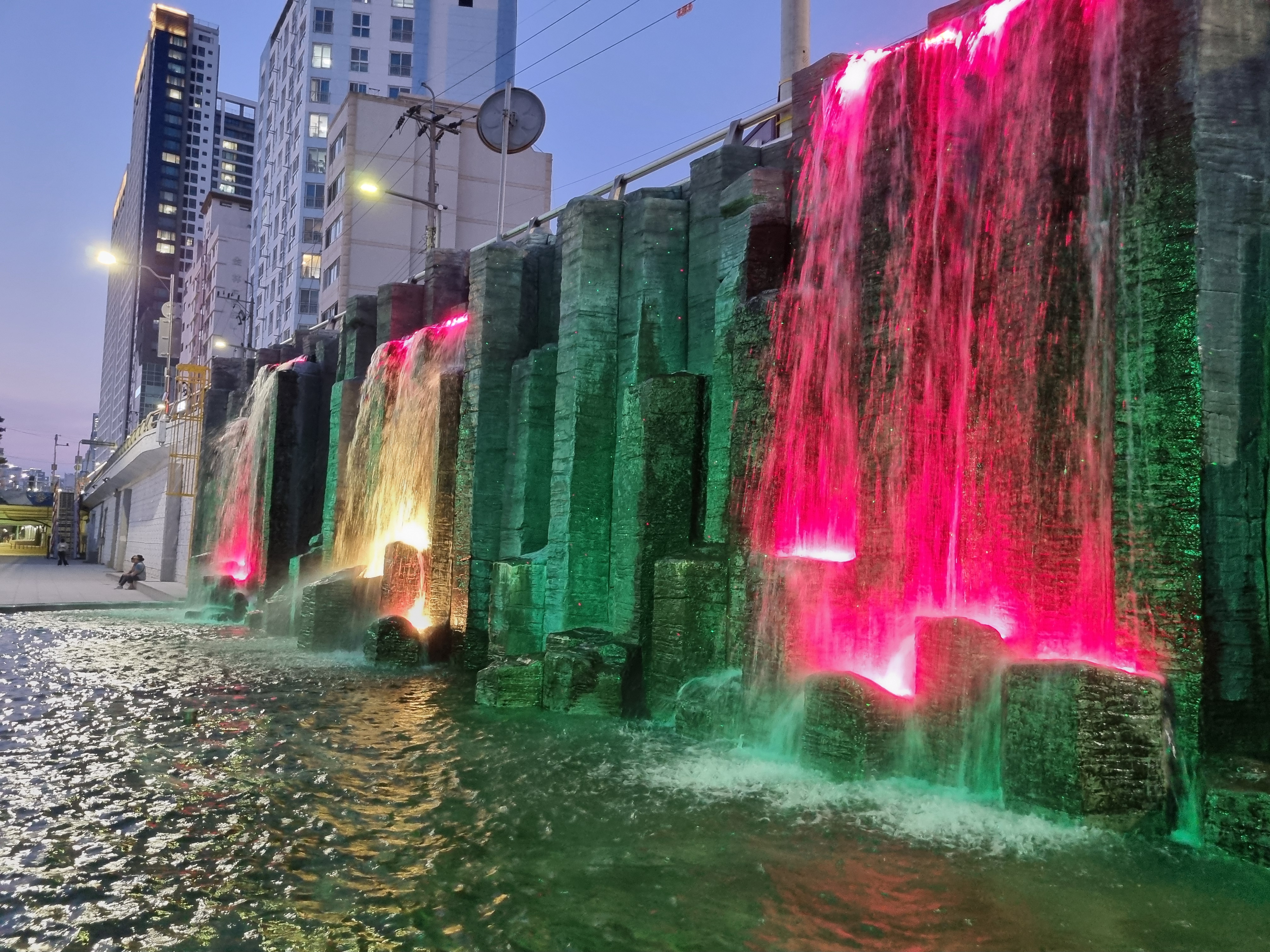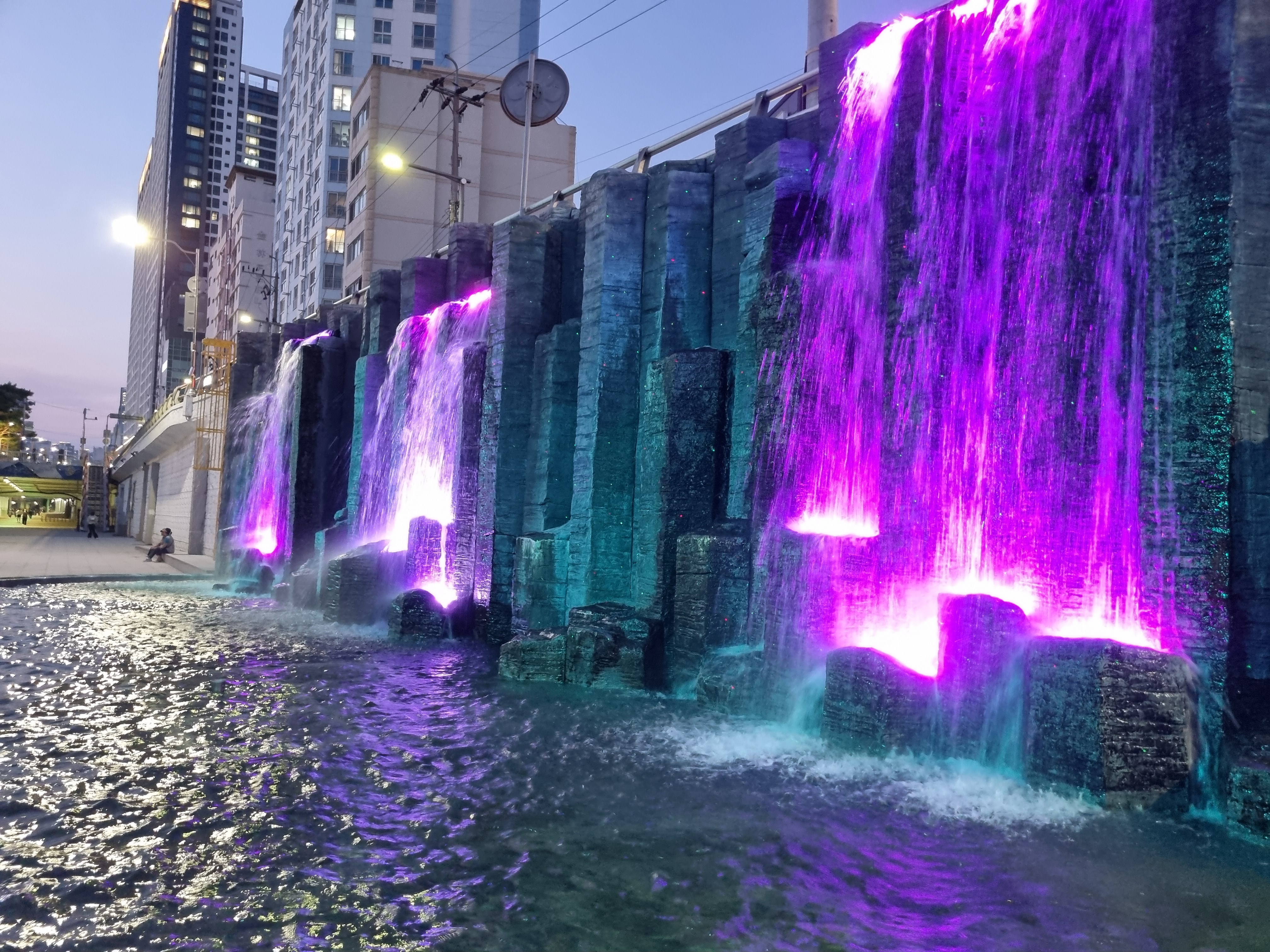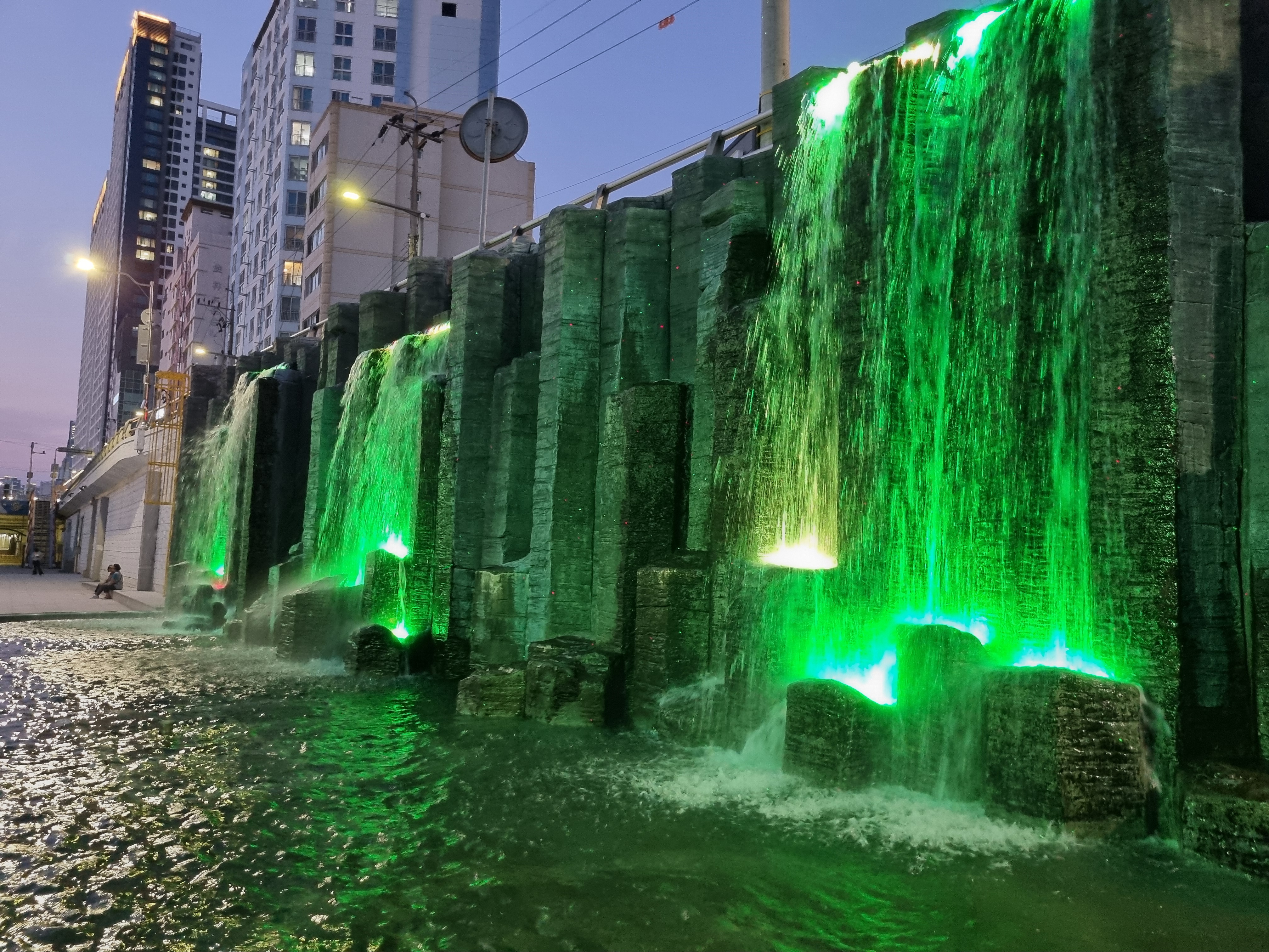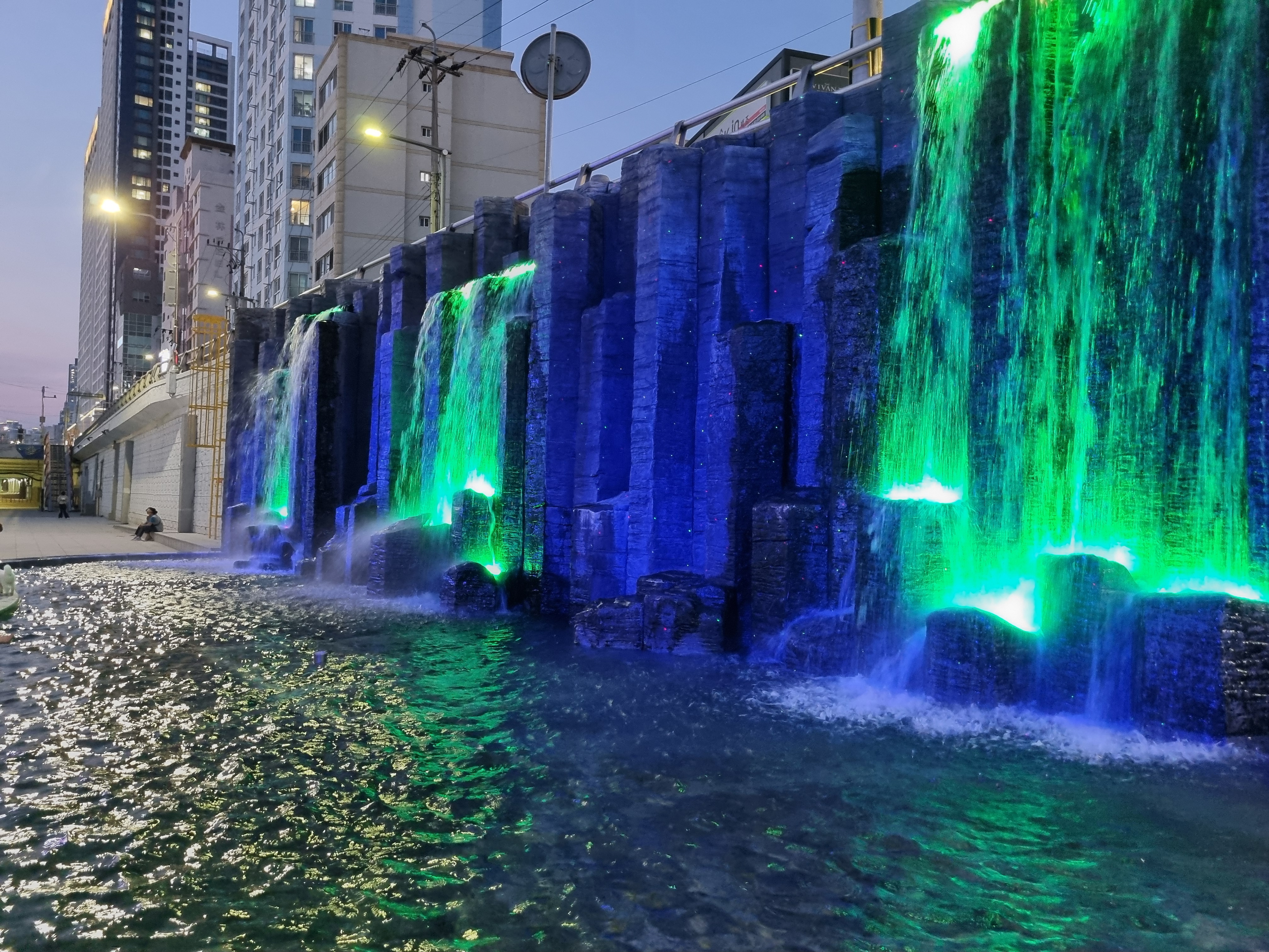 온천천 야간 산책 중 만나는 인공폭포 조명,