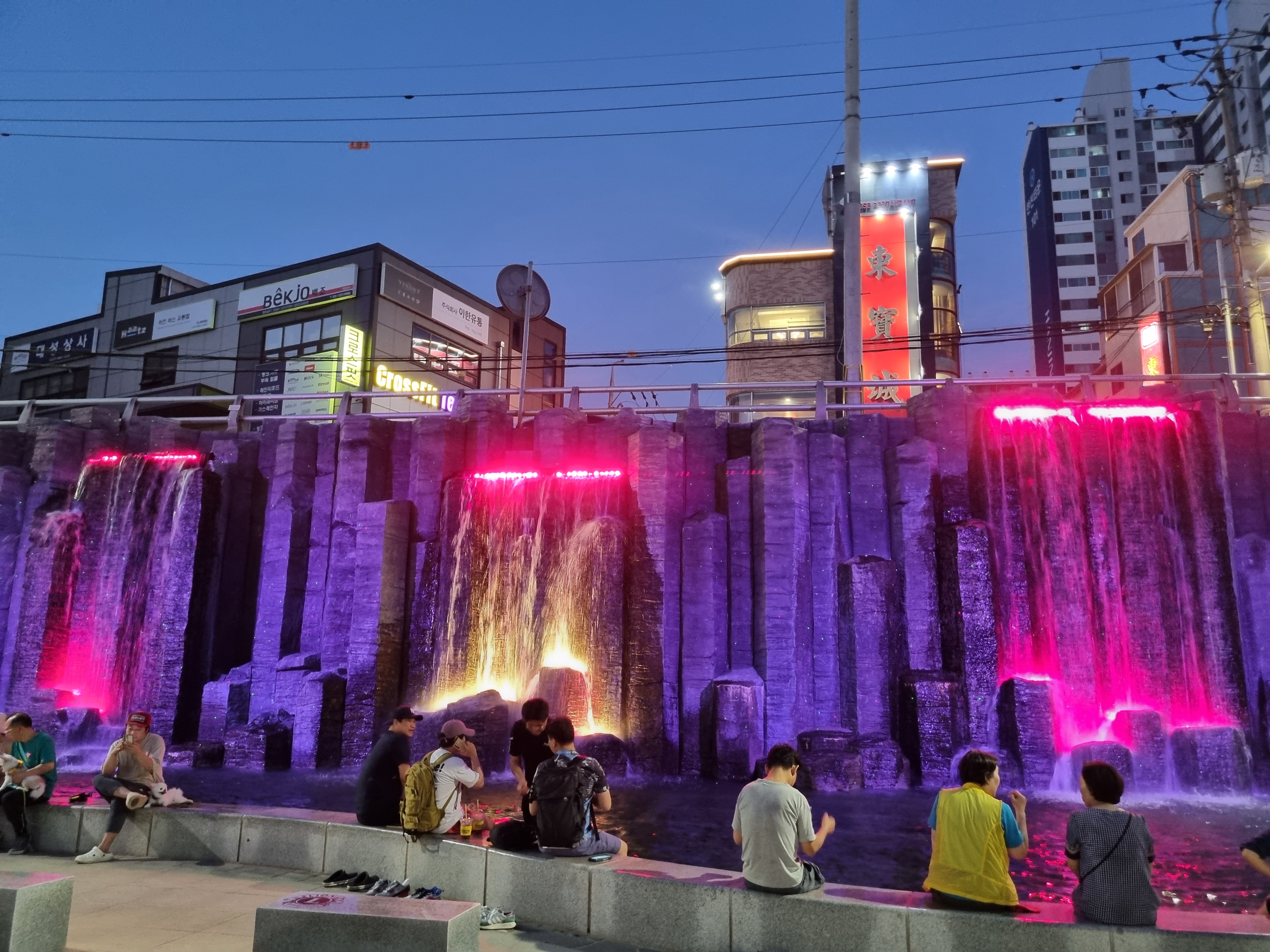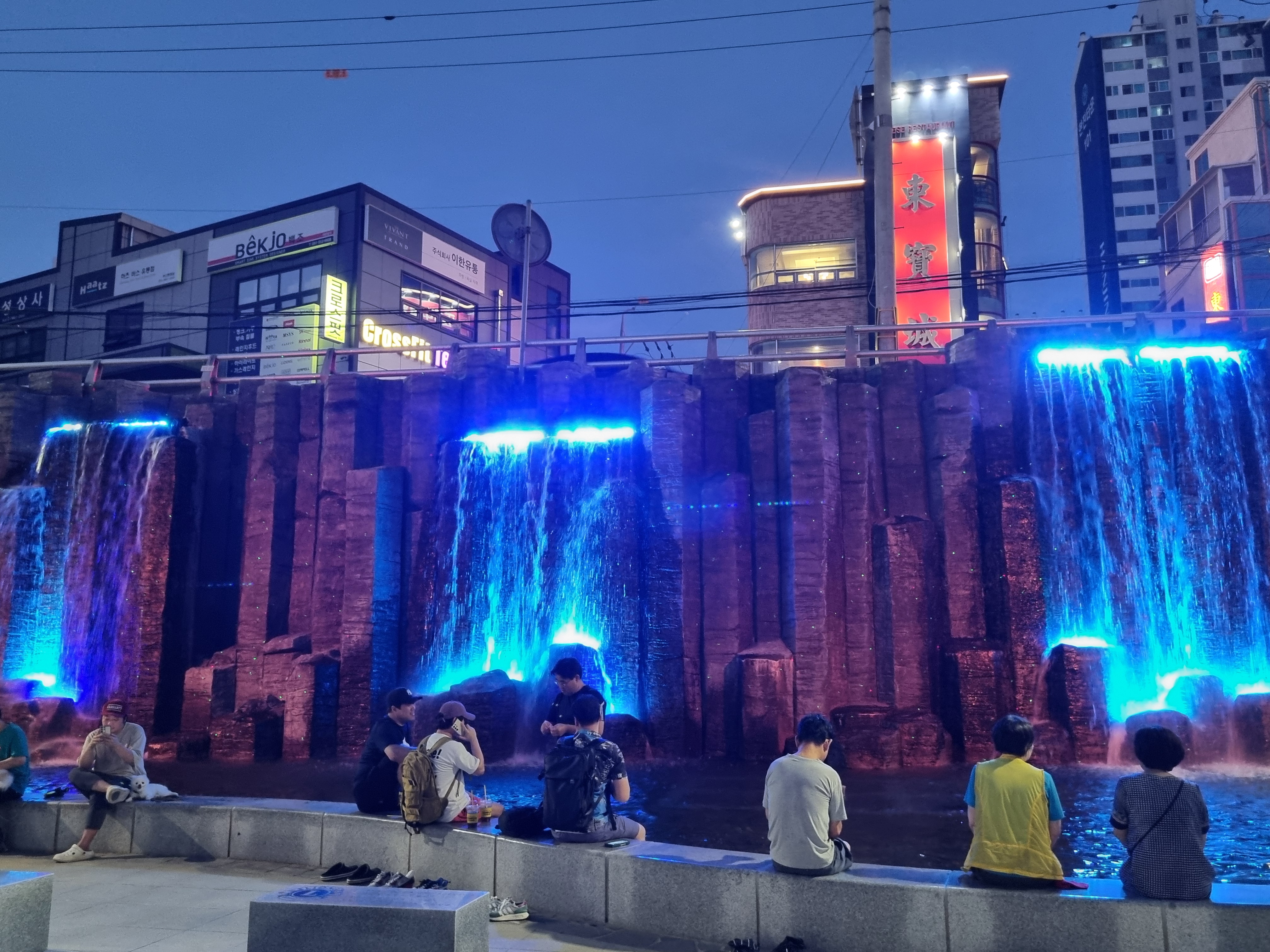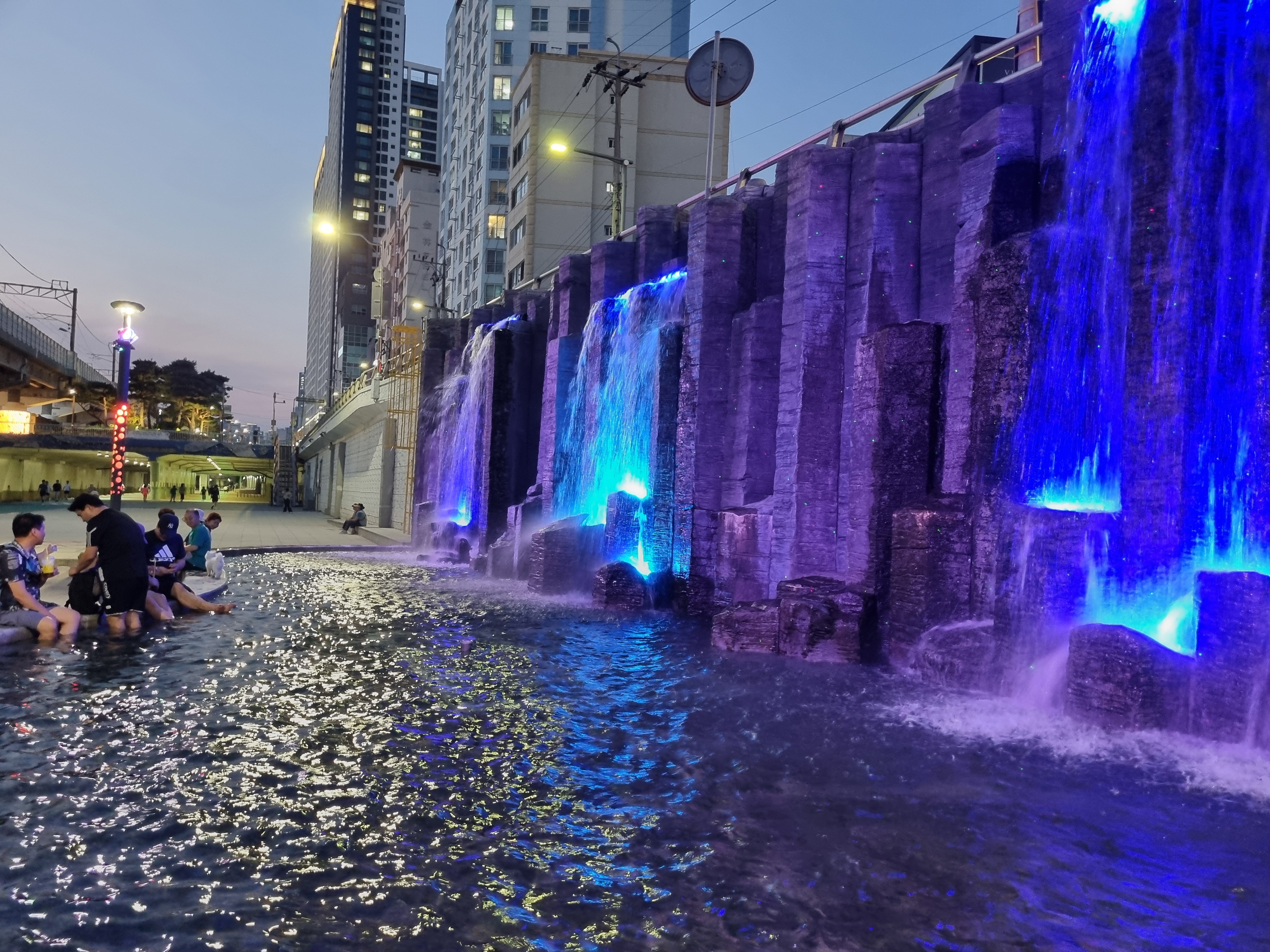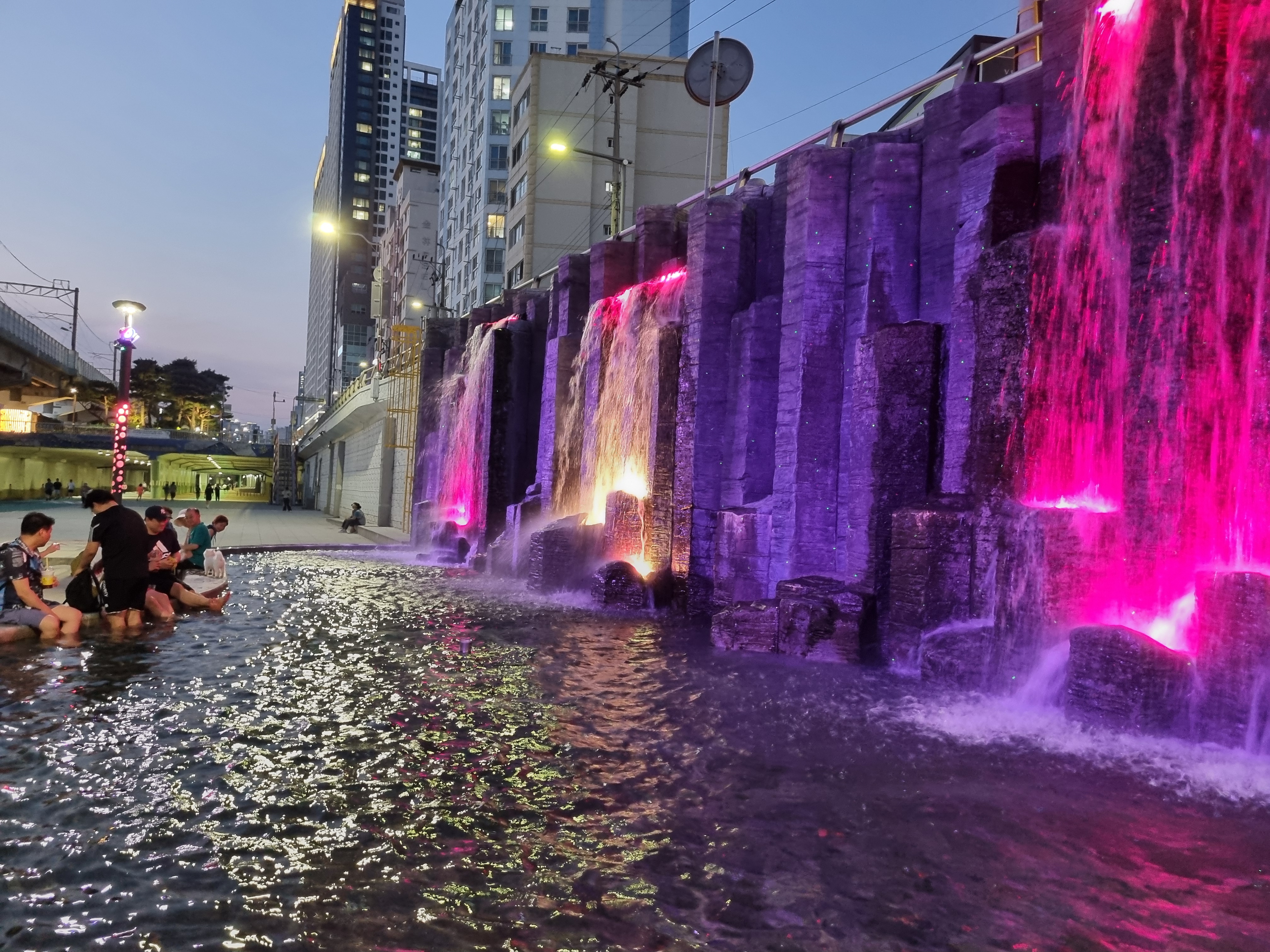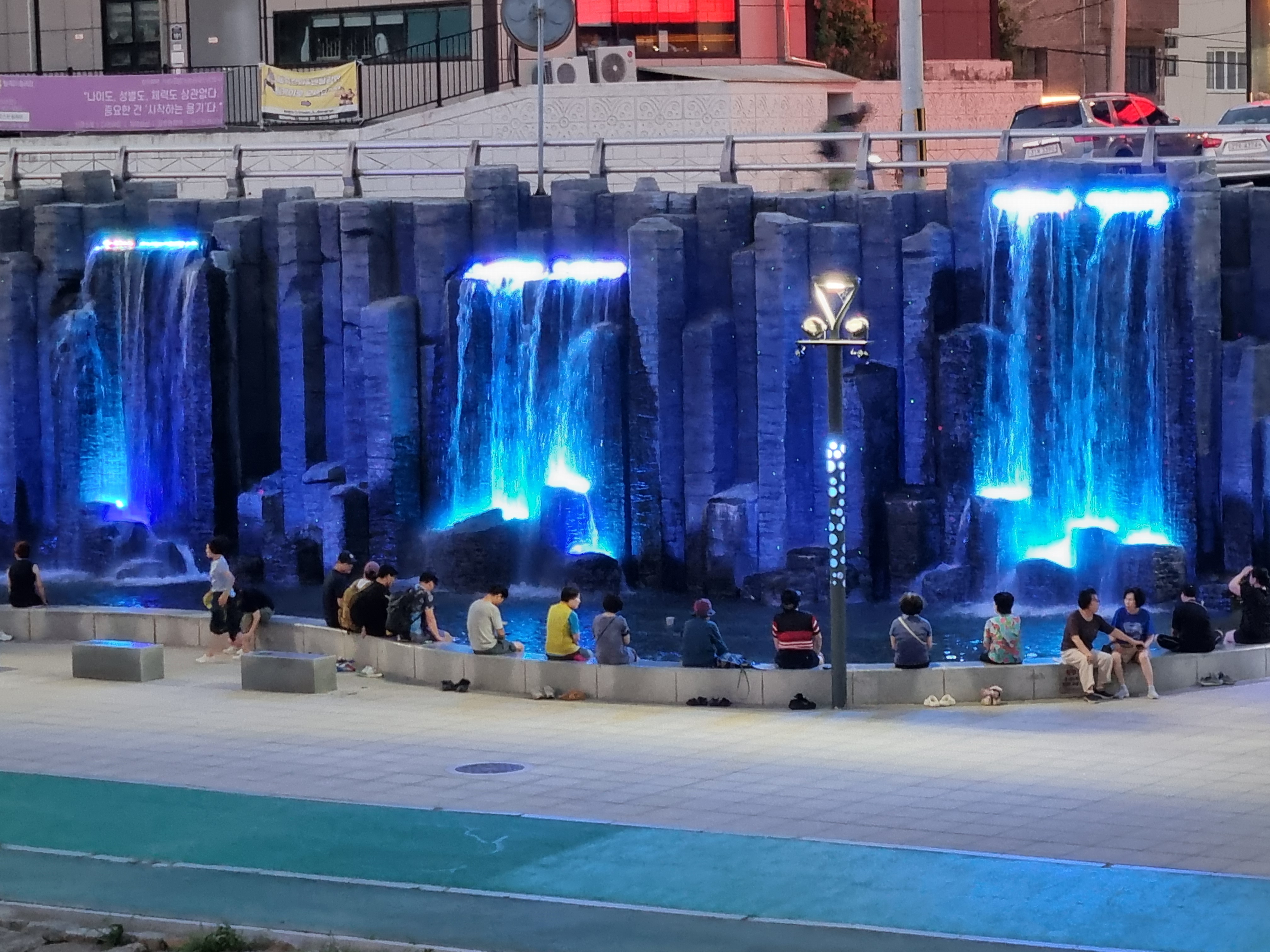온천천 야간 산책 중 만나는 인공폭포 조명,