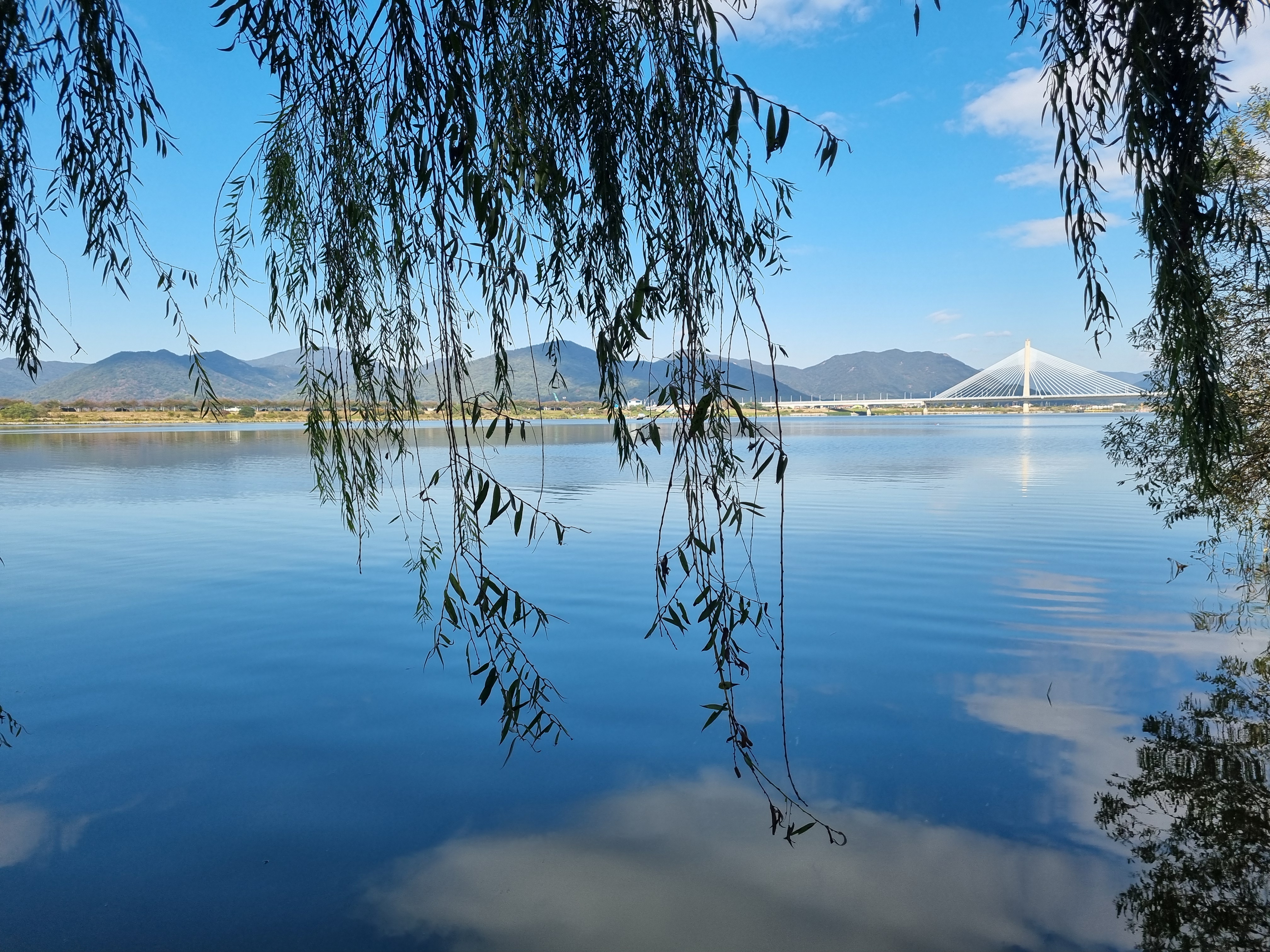 ↑ 낙동강. 늘어진 수양버들가지 옆 화명대교