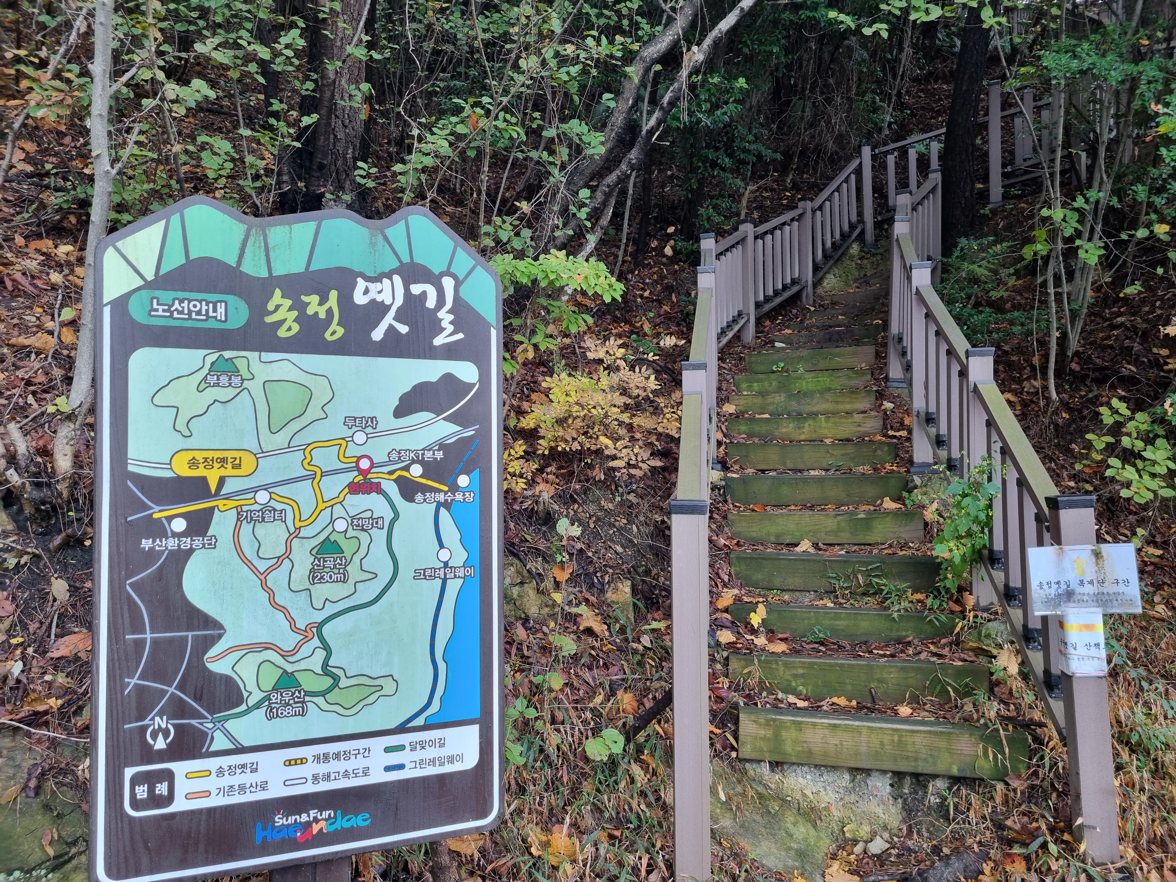 ↑ 좌동지하차도 교차로 옆 송정옛길 입구. 계단을 오르면 고흐의 길~ 송정옛길로 연결된다.